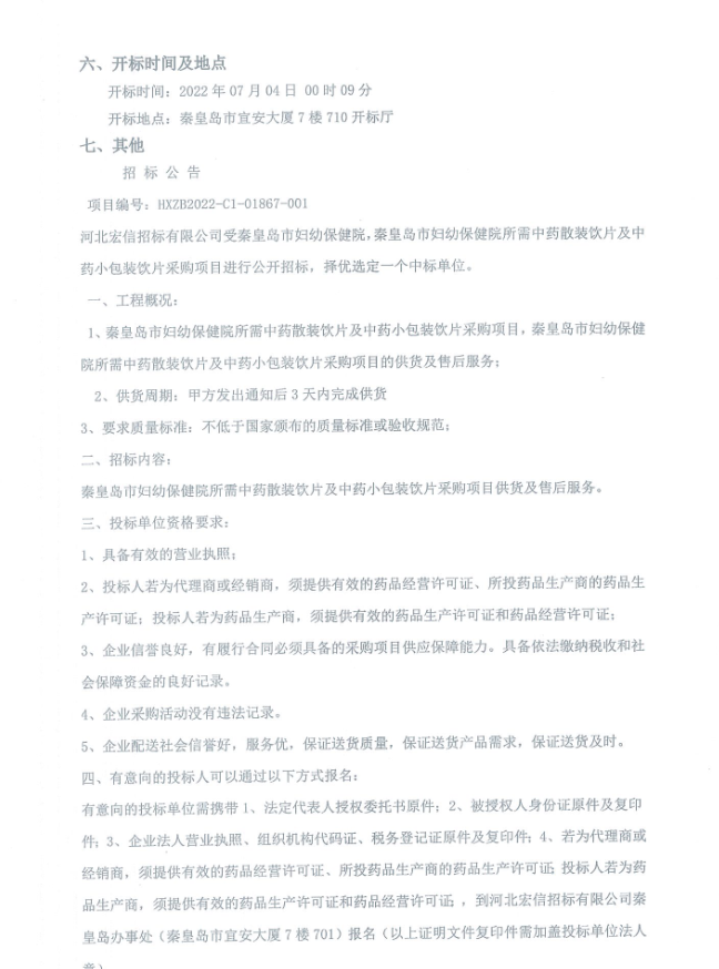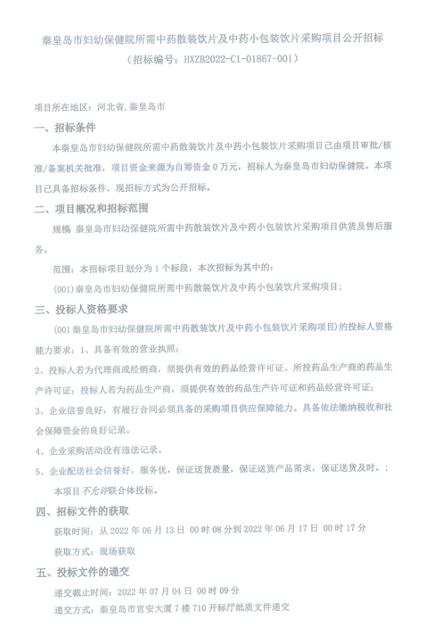 河北秦皇岛市妇幼保健院所需中药散装饮片及中药小包装饮片采购公开招标