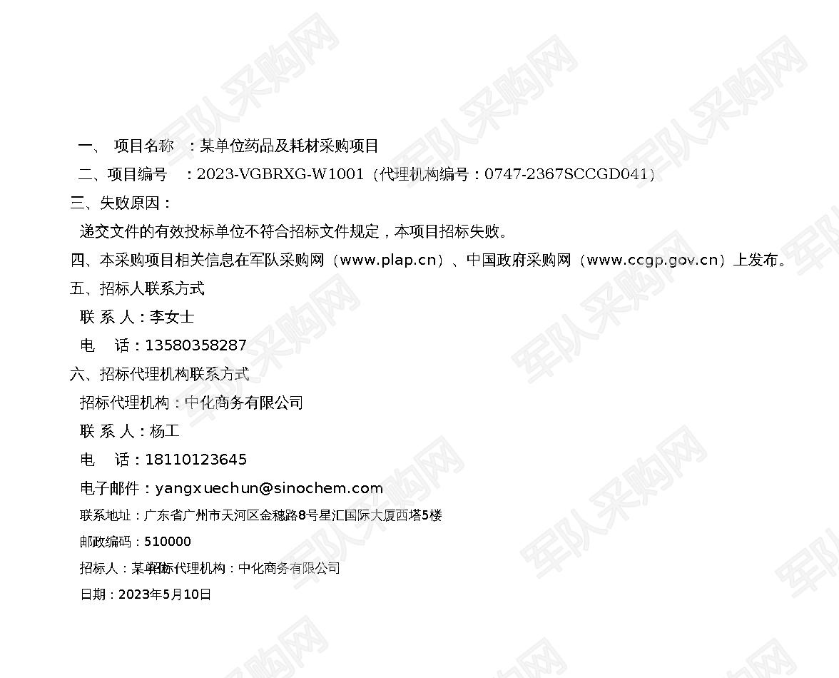 【军队采购】军队采购网某单位药品及耗材采购项目招标失败公示2023-VGBRXG-W1001