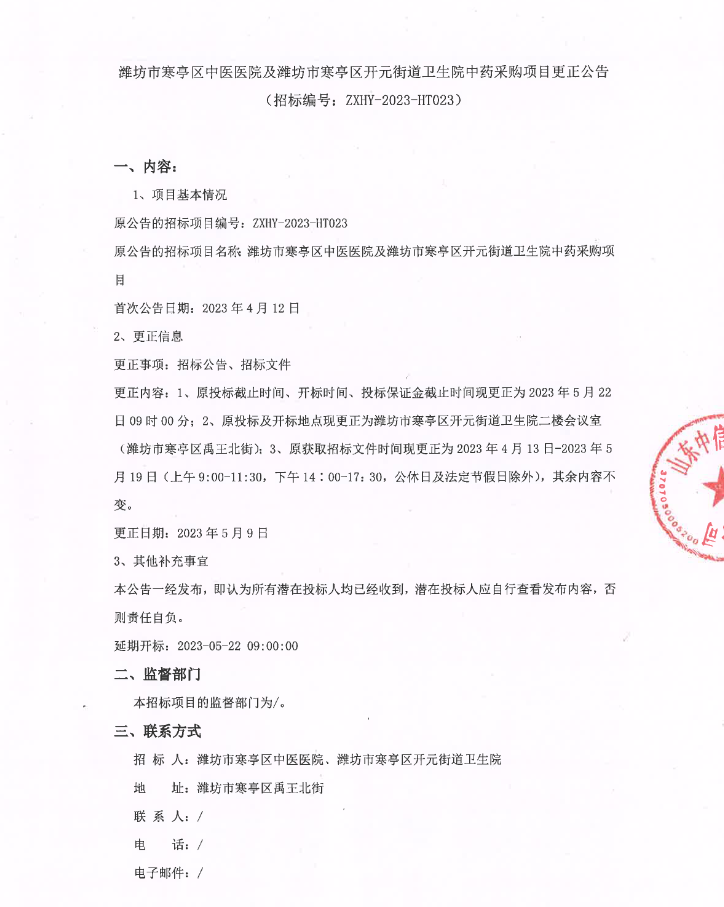 【潍坊市寒亭区中医医院】山东省潍坊市寒亭区中医医院及潍坊市寒亭区开元街道卫生院中药采购项目更正公告