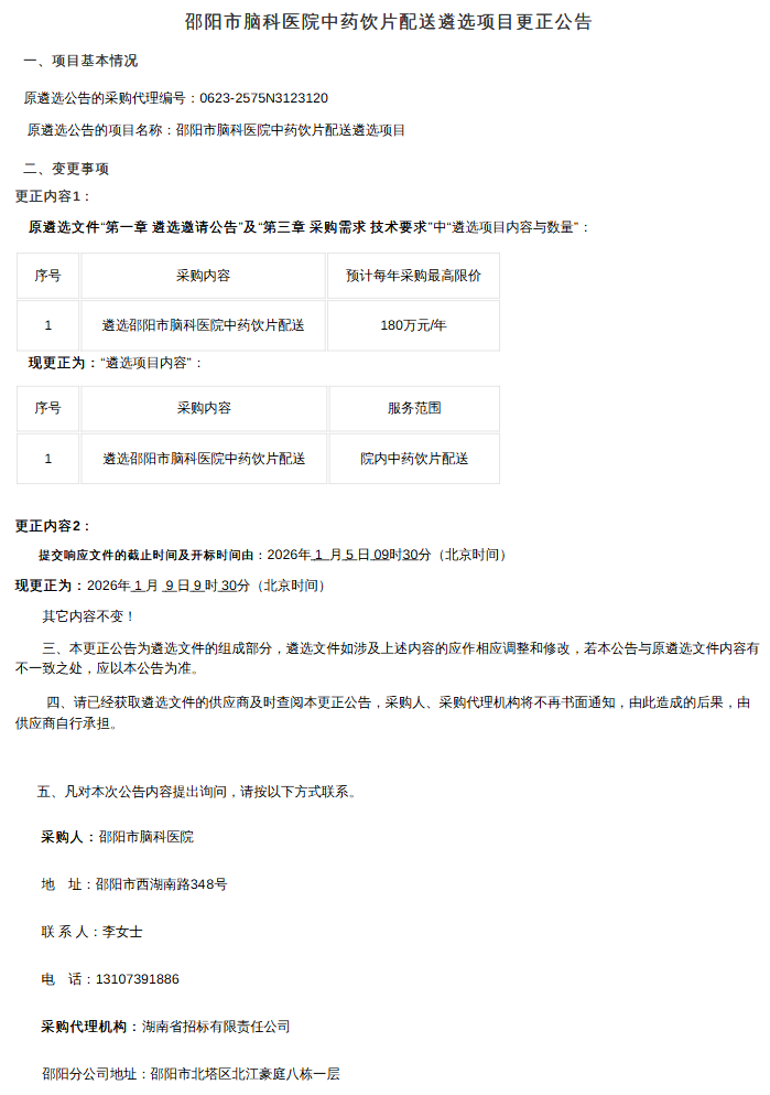 【邵阳市脑科医院】湖南省邵阳市脑科医院中药饮片配送遴选项目更正公告