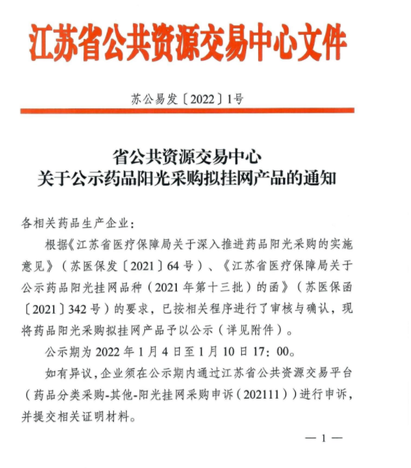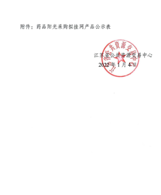 【江苏】江苏省公共资源交易中心关于公示药品阳光采购拟挂网产品的通知(20220104)