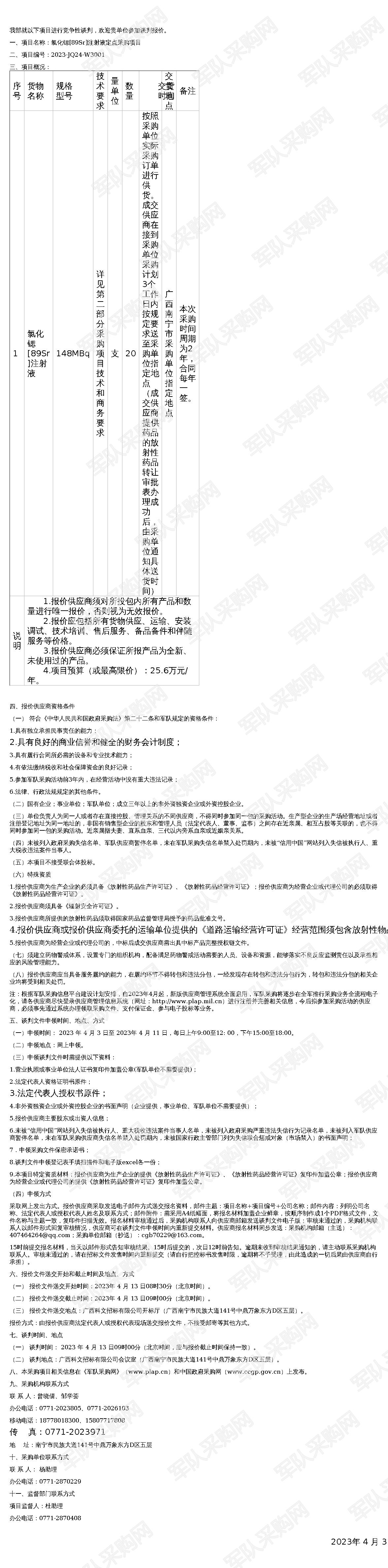 【南宁市某医院】军队采购网南宁市某医院氯化锶〔89Sr〕注射液定点采购项目竞争性谈判公告(项目编号:2023-JQ24-W3001)