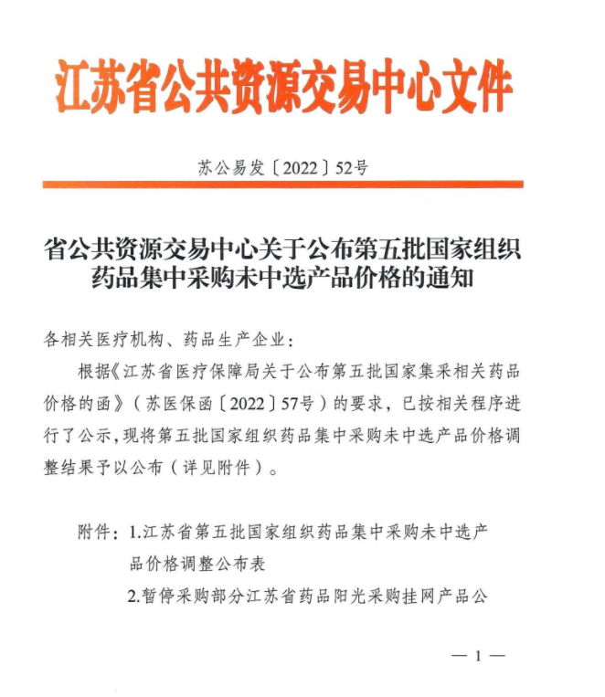 【江苏】省公共资源交易中心关于公布第五批国家组织药品集中采购未中选产品价格的通知