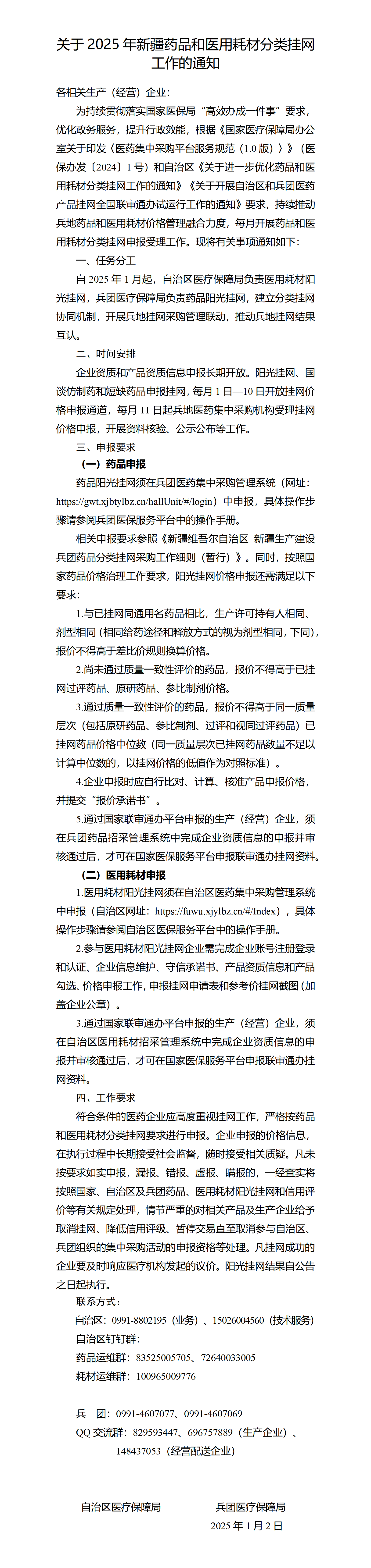 【新疆】关于2025年新疆药品和医用耗材分类挂网工作的通知