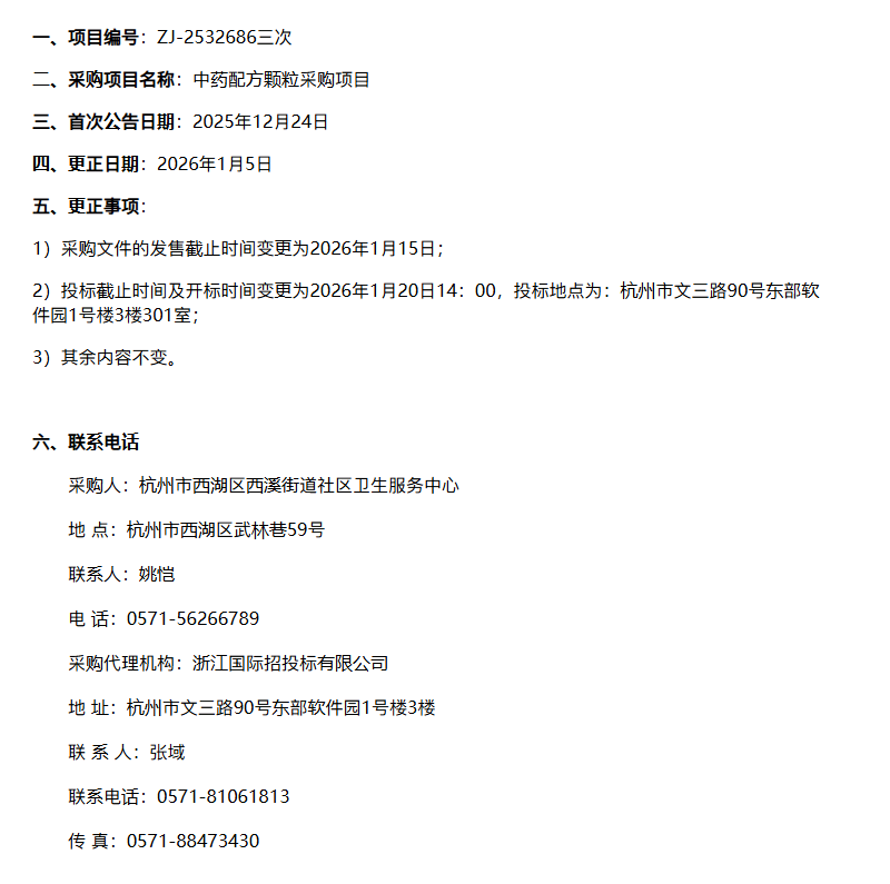 【杭州市西湖区西溪街道社区卫生服务中心】浙江国际招投标有限公司关于杭州市西湖区西溪街道社区卫生服务中心中药配方颗粒采购项目(重招2)的变更公告
