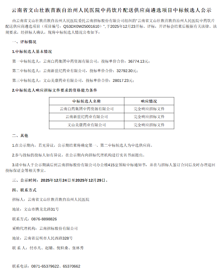 【文山壮族苗族自治州人民医院】云南省文山壮族苗族自治州人民医院中药饮片配送供应商遴选项目中标候选人公示