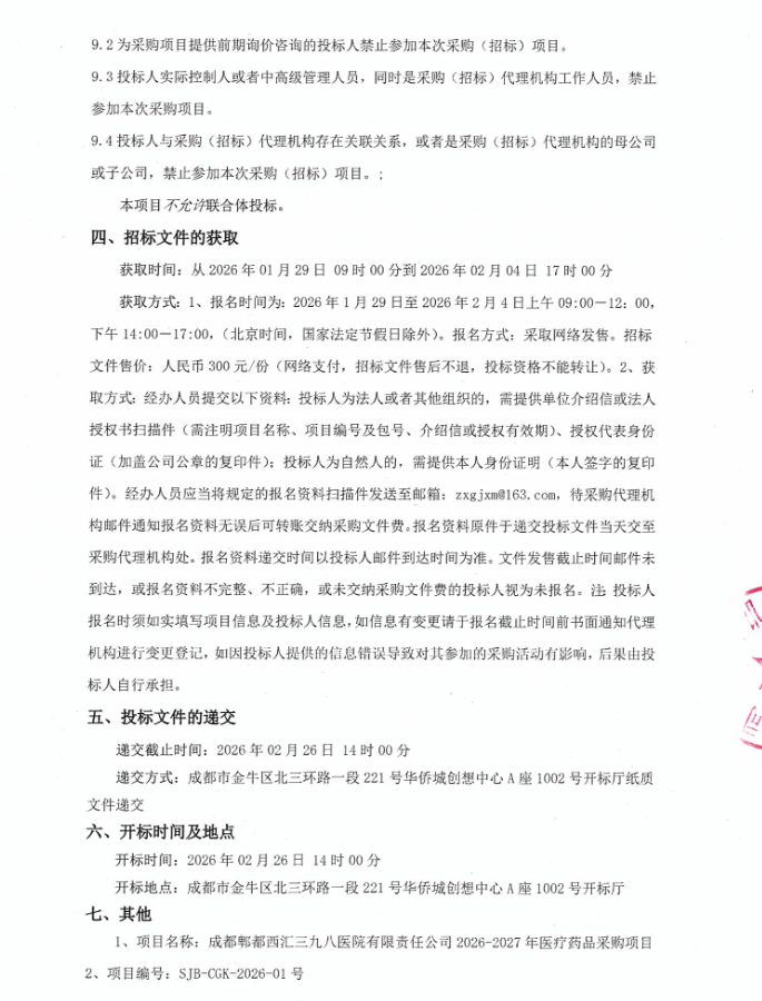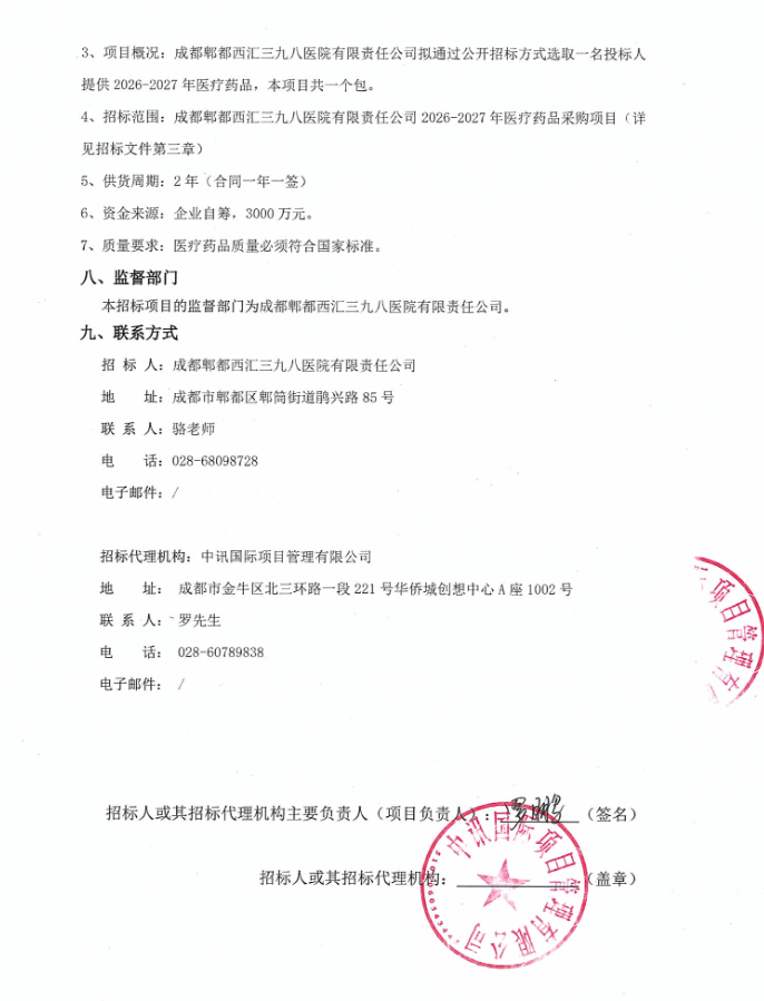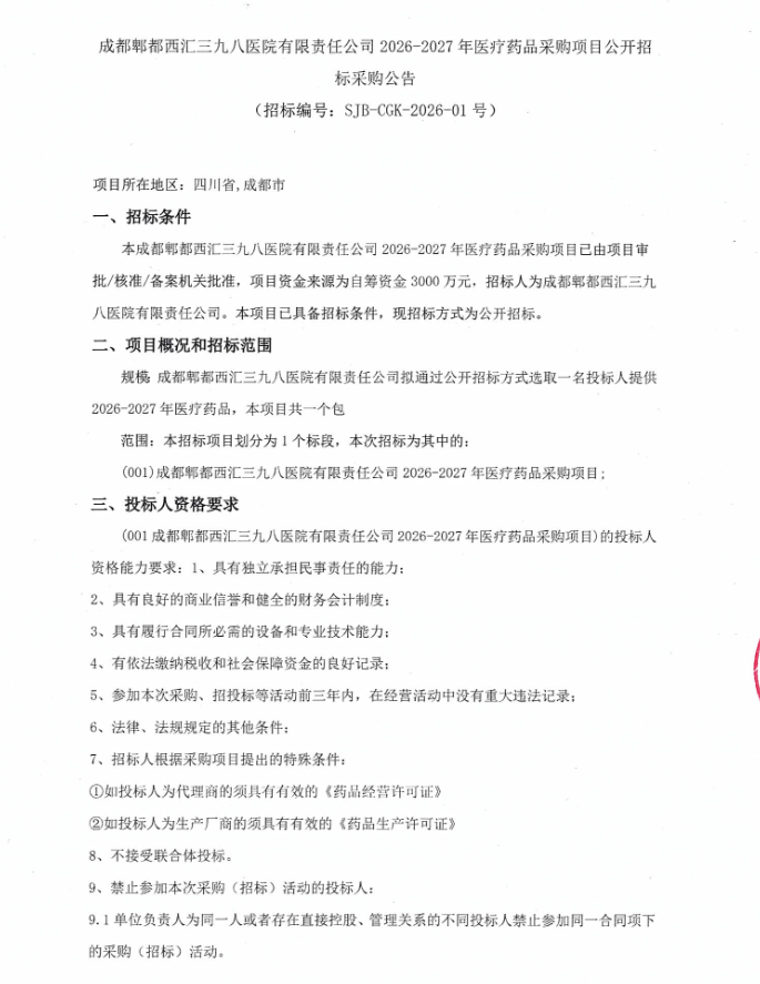 【成都郫都西汇三九八医院】四川省成都郫都西汇三九八医院有限责任公司2026-2027年医疗药品采购项目公开招标采购公告