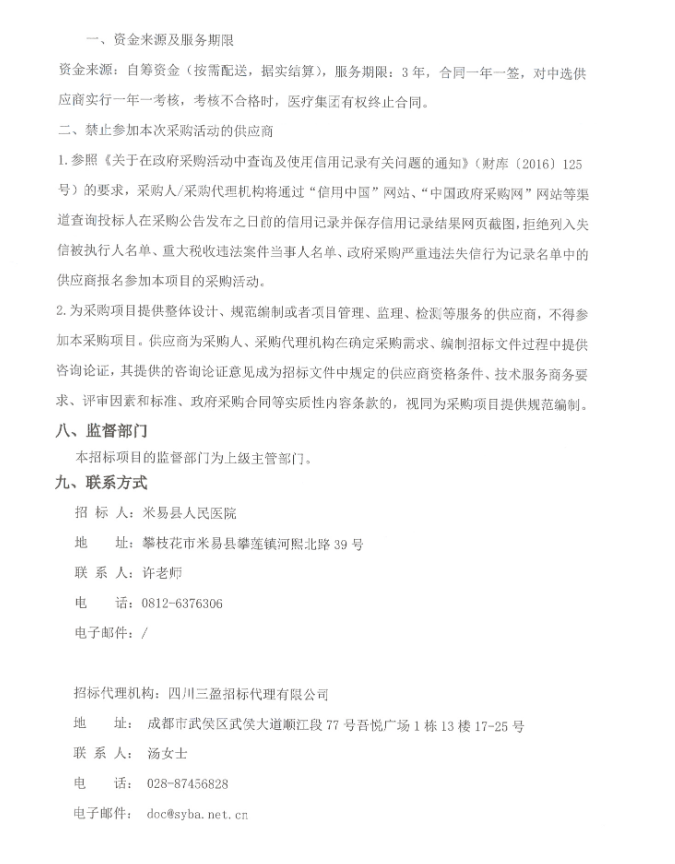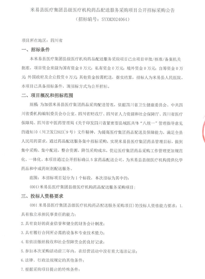 【攀枝花市米易县人民医院】四川省攀枝花市米易县医疗集团县级医疗机构药品配送服务采购项目公开招标采购公告