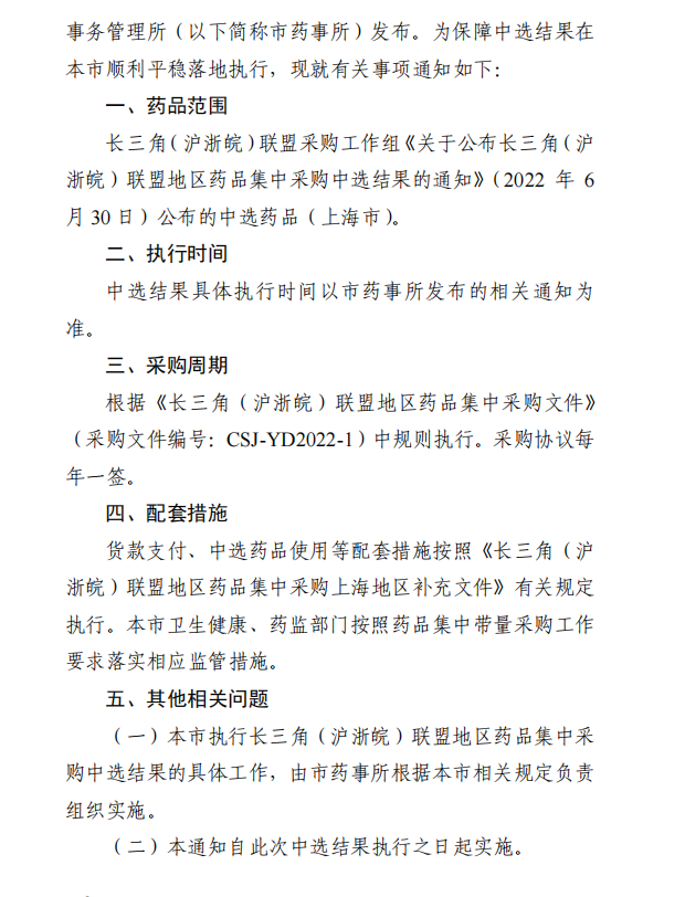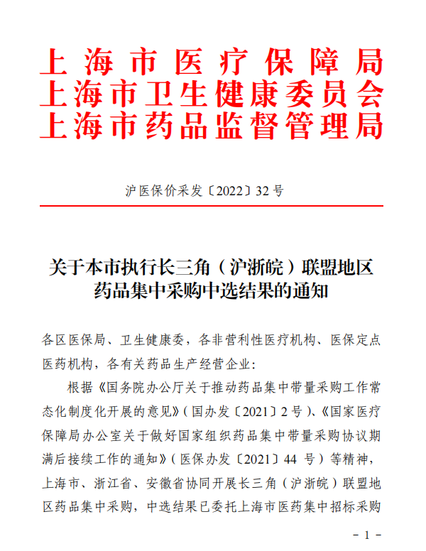 【上海】关于本市执行长三角(沪浙皖)联盟地区药品集中采购中选结果的通知