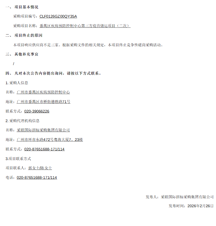 【广州市番禺区疾病预防控制中心】东省广州市番禺区疾病预防控制中心第三方疫苗储运项目(二次)(CLF0126GZ00QY35A)终止公告