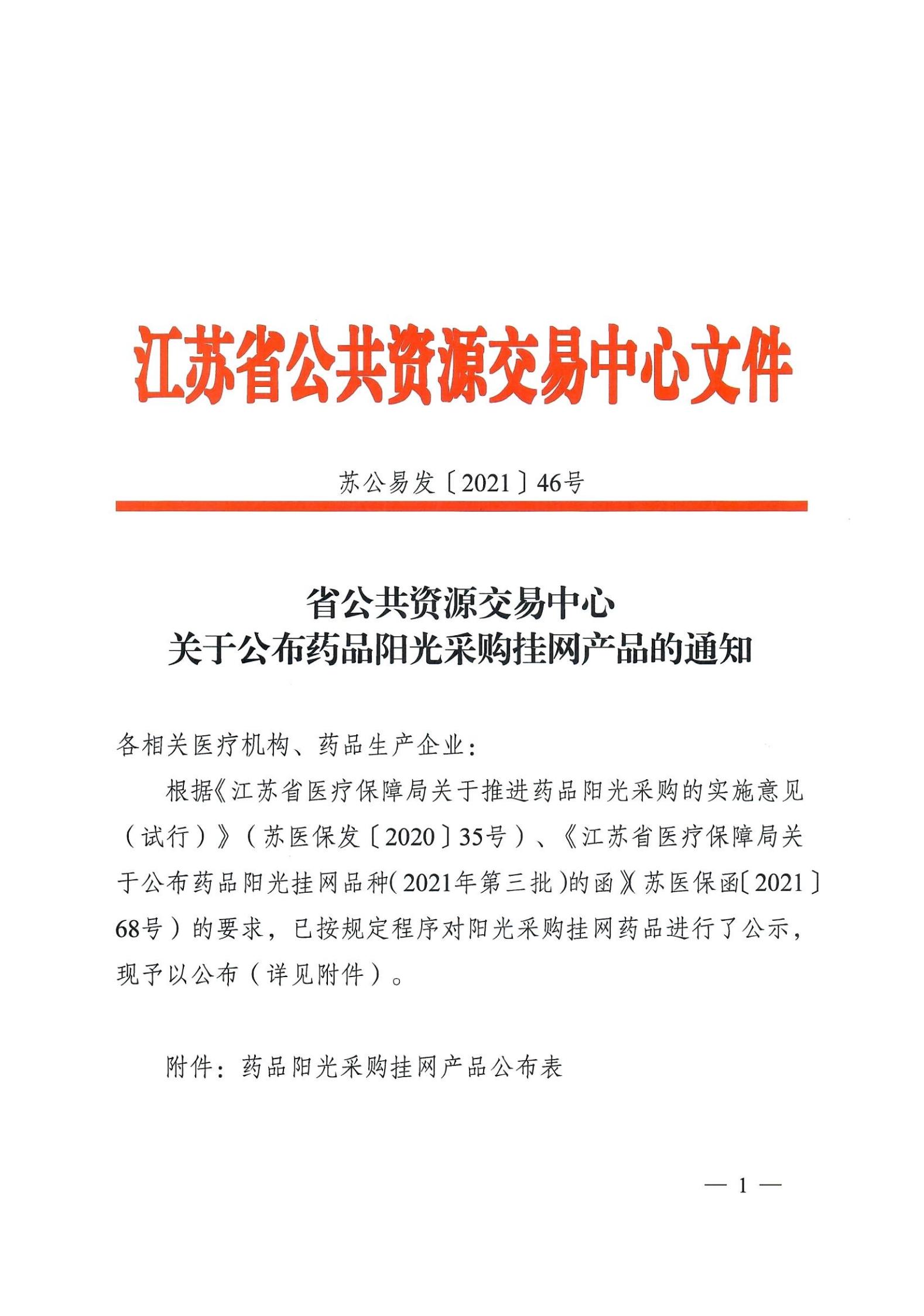 【江苏】2021年江苏省公共资源交易中心关于公布药品阳光采购挂网产品的通知 苏公易发[2021]46号