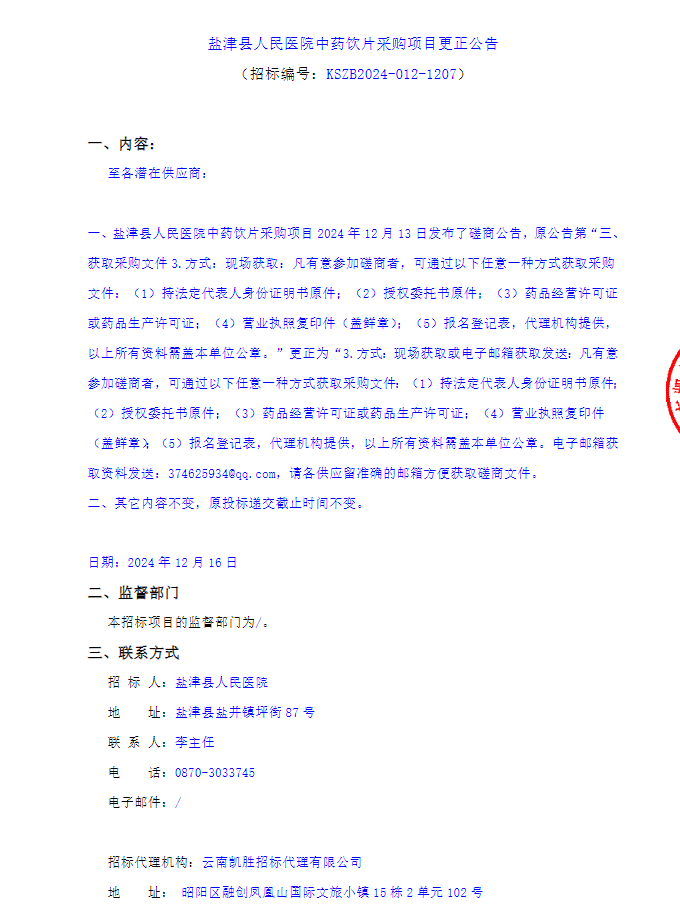 【昭通市盐津县人民医院】云南省昭通市盐津县人民医院中药饮片采购项目更正公告