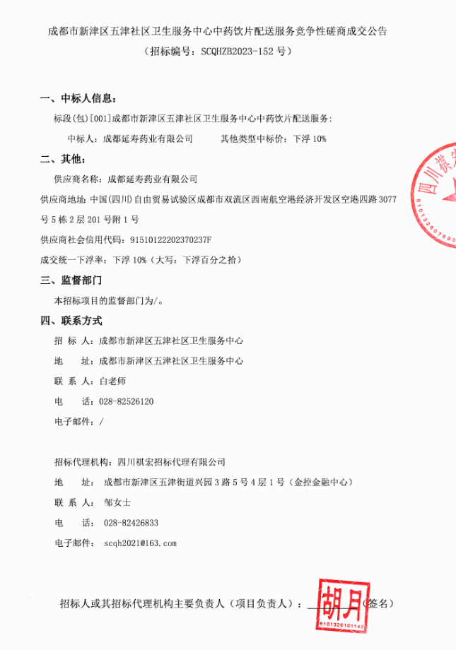 【成都市新津区五津社区卫生服务中心】四川省成都市新津区五津社区卫生服务中心中药饮片配送服务竞争性磋商成交公告