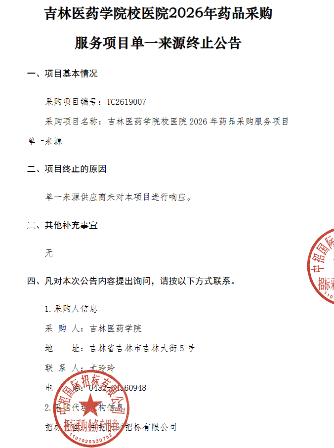 【吉林医药学院】吉林医药学院申请确定药品供应商项目〔重新招标〕-终止公告
