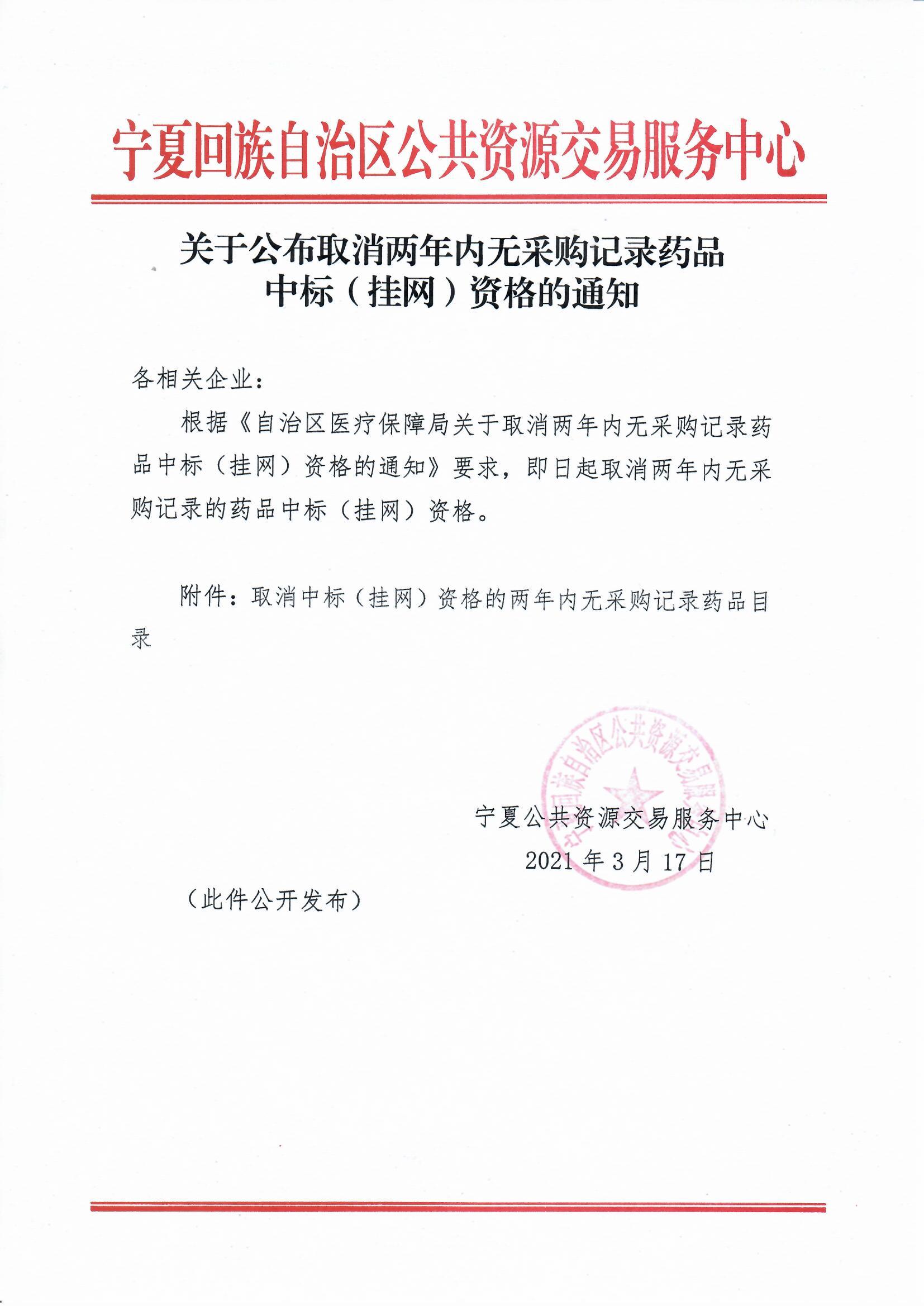 【宁夏】2021年宁夏自治区关于公布取消两年内无采购记录药品中标(挂网)资格的通知