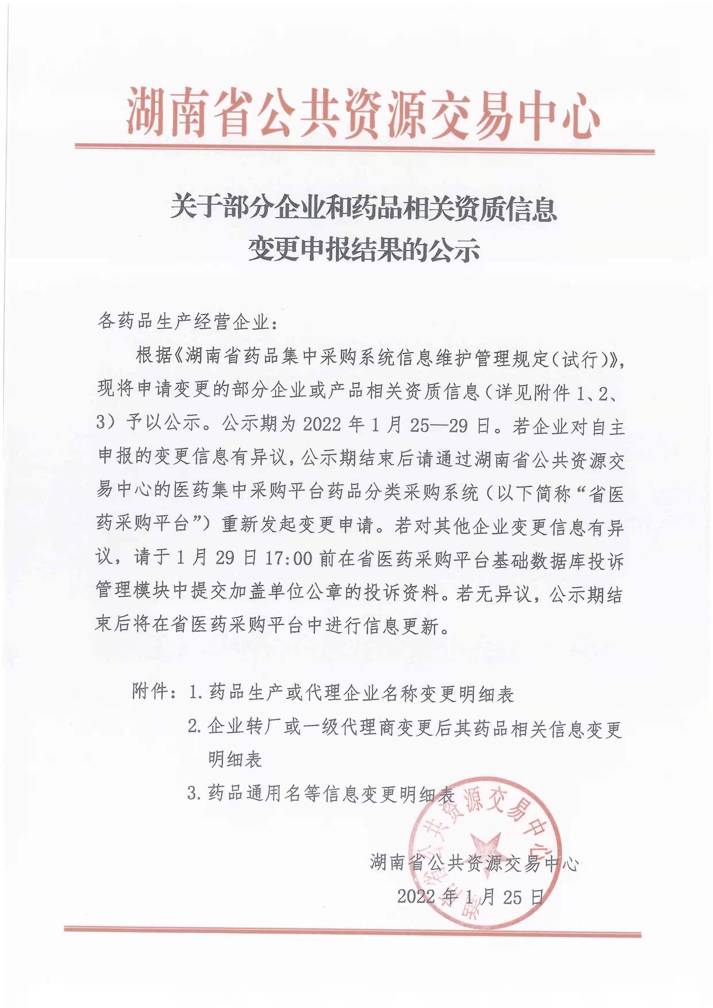【湖南】湖南省关于部分企业和药品相关资质信息变更申报结果的公示(20220125)
