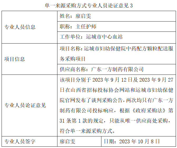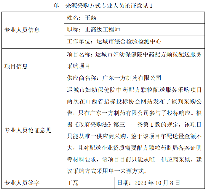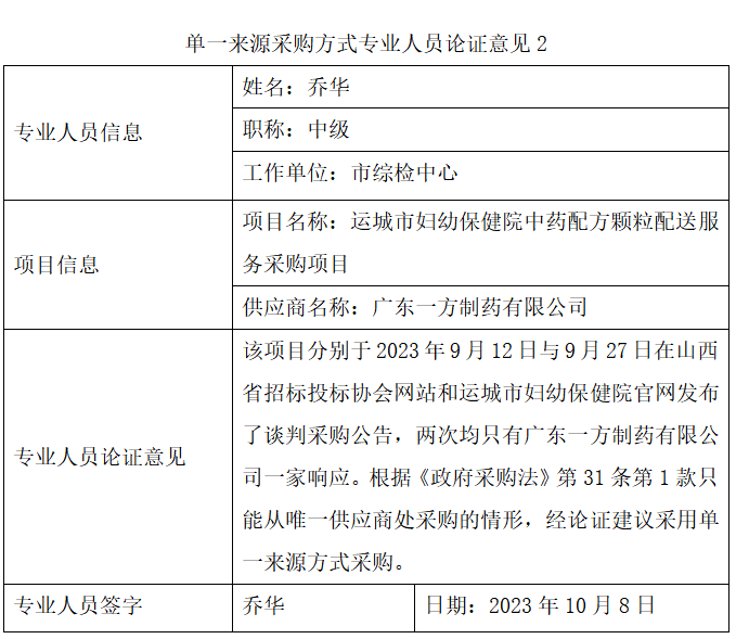 采用单一来源采购方式的原因及说明:运城市妇幼保健院中药配方颗粒配送服务采购项目第一次公告于2023年9月12日在山西省招标投标协会网站和运城市妇幼保健院官网发布了谈判采购公告,截止开标时间,只有广东一方制药有限公司参与了投标,因有效供应商不足三家,于2023年9月26日发布了流标公告。该项目于2023年9月27日在山西省招标投标协会网站和运城市妇幼保健院官网发布了二次谈判采购公告,截止报名时间只有广东一方制药有限公司获取了谈判文件,因报名不足三家,于2023年10月8日发布了二次流标公告,由于该项目两次招标,均只有1家公司参与,请专家对该项目能否改为单一来源采购进行论证。
