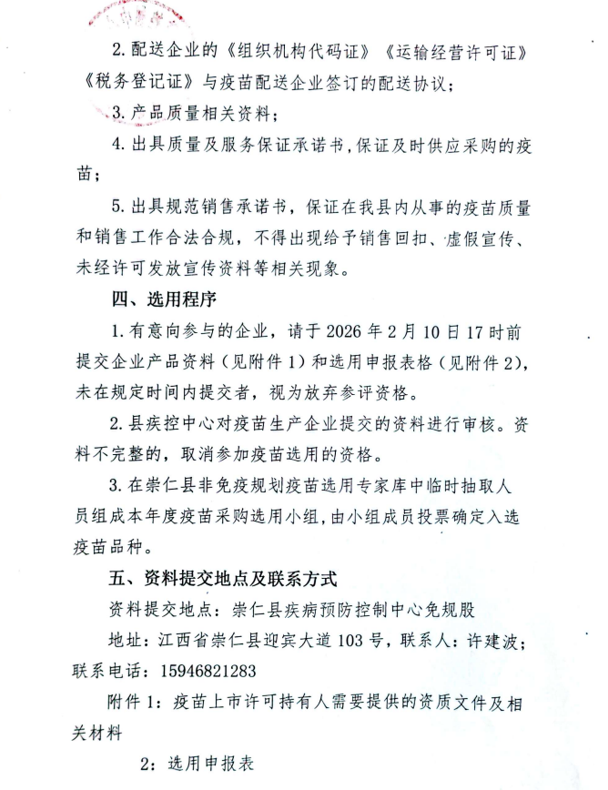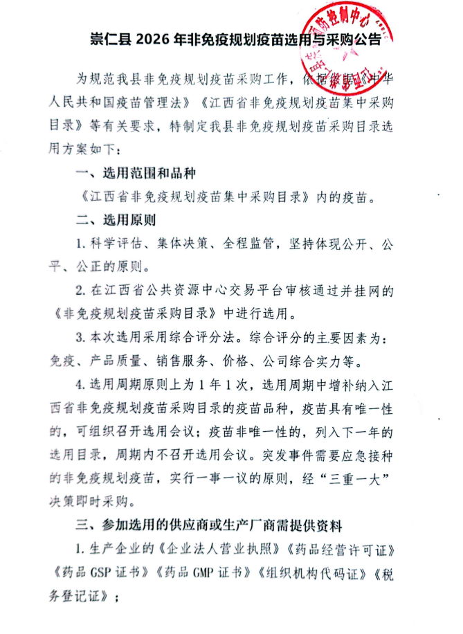 【抚州】崇仁县2026年非免疫规划疫苗选用与采购公告