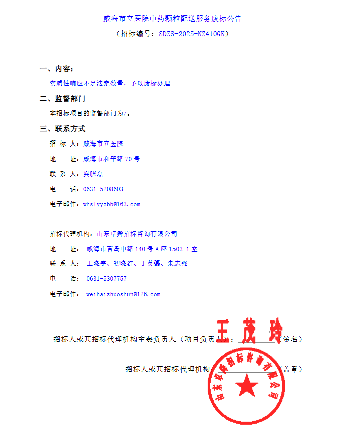 【威海市立医院】山东省威海市立医院中药颗粒配送服务废标公告