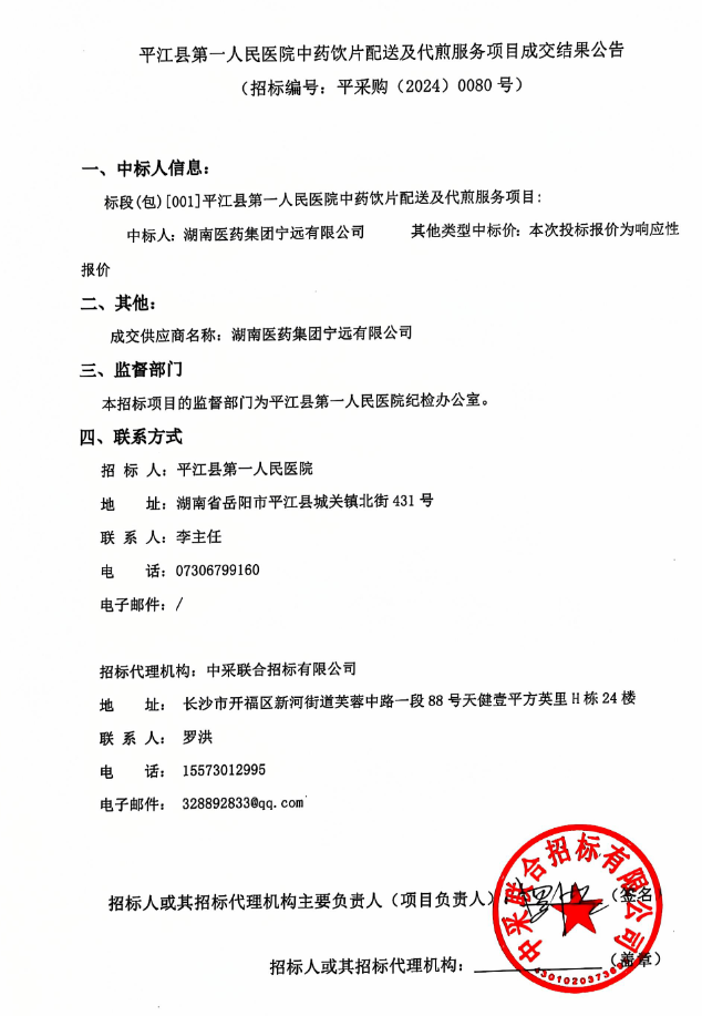 【岳阳市平江县第一人民医院】湖南省岳阳市平江县第一人民医院中药饮片配送及代煎服务项目成交结果公告