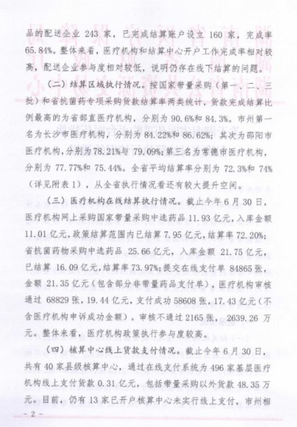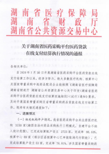 【湖南】2021年湖南省关于湖南省医药采购平台医药货款在线支付结算执行情况的通报