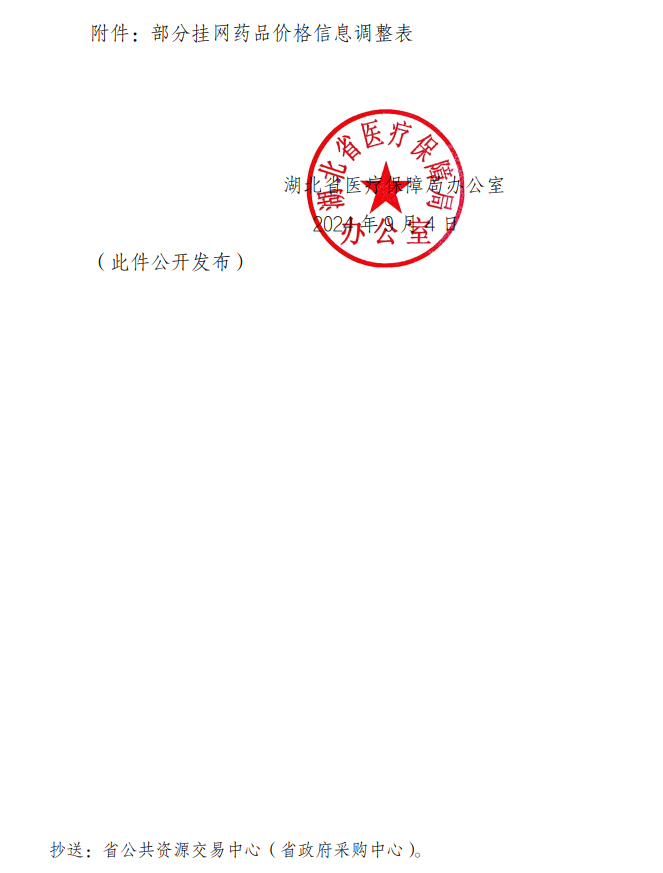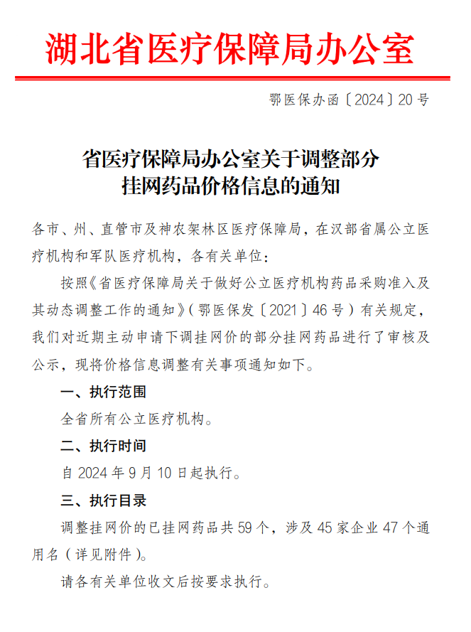 【鄂州】鄂医保办函〔2024〕20 号省医疗保障局办公室关于调整部分挂网药品价格信息的通知