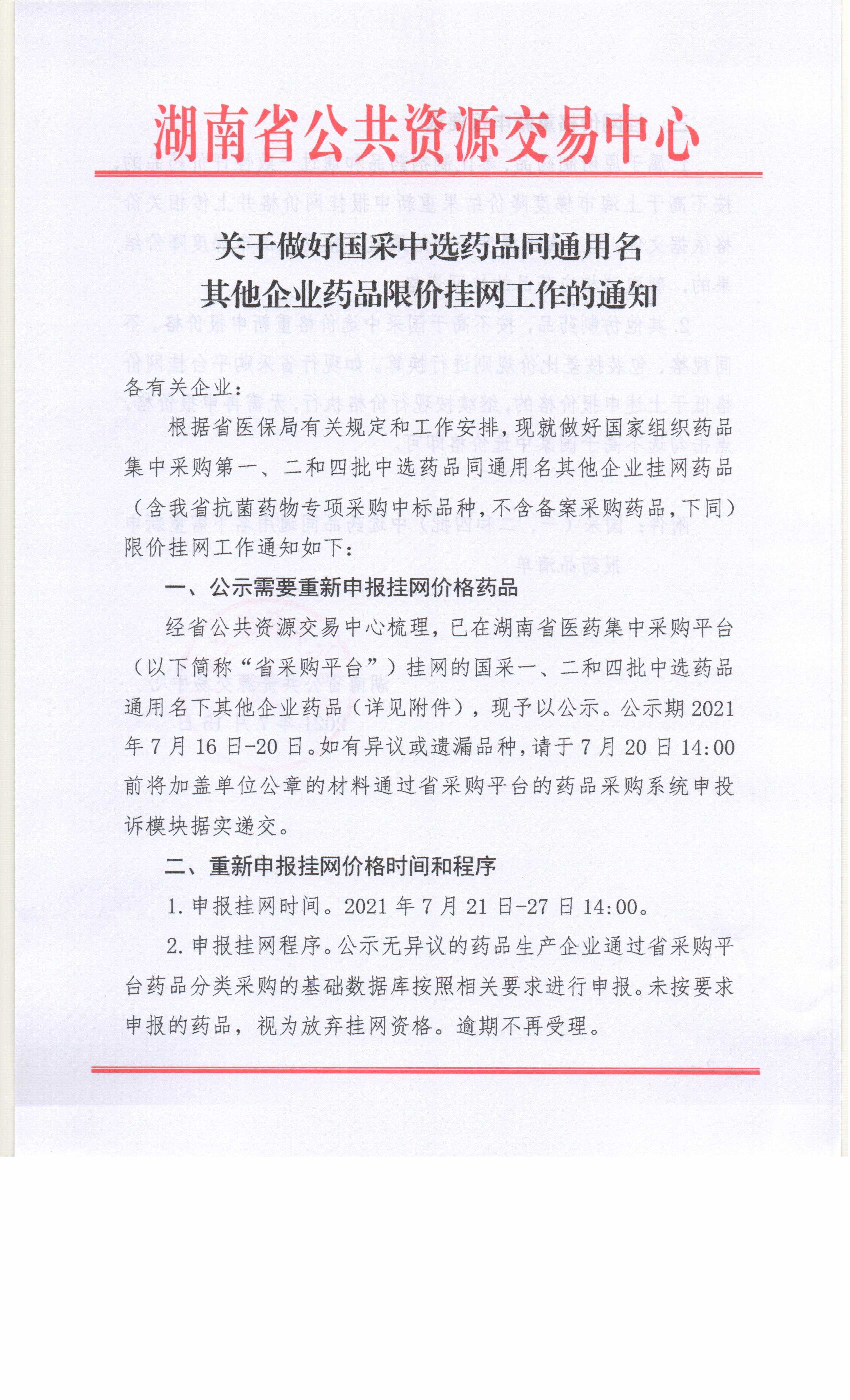 【湖南】2021年湖南省关于做好国采中选药品同通用名其他企业药品限价挂网工作的通知