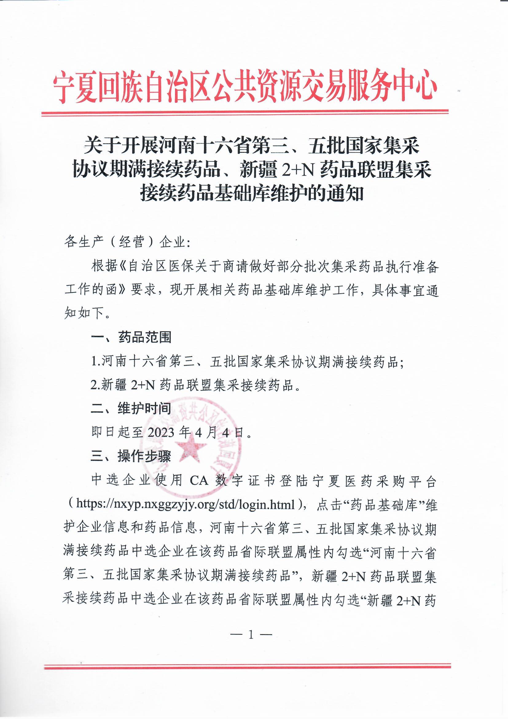 中选企业使用CA数字证书登陆宁夏医药采购平台(https://nxyp.nxggzyjy.org/std/login.html),点击“药品基础库”维护企业信息和药品信息,河南十六省第三、五批国家集采协议期满接续药品中选企业在该药品省际联盟属性内勾选“河南十六省第三、五批国家集采协议期满接续药品",新疆2+N药品联盟集采接续药品中选企业在该药品省际联盟属性内勾选“新疆2+N药品联盟集采接续药品"。已在宁夏医药采购平台维护药品基础库信息的中选药品,点击“产品信息管理—产品信息变更”,补充维护省际联盟中选药品、省际联盟来源等属性。具体操作见宁夏医药采购平台“首页理—帮助文档理——药品基础库操作手册”。