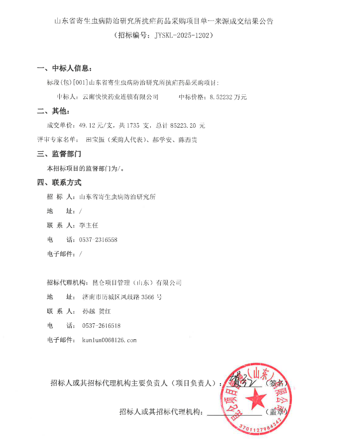 【山东省寄生虫病防治研究所】山东省寄生虫病防治研究所抗疟药品采购项目单一来源成交结果公告