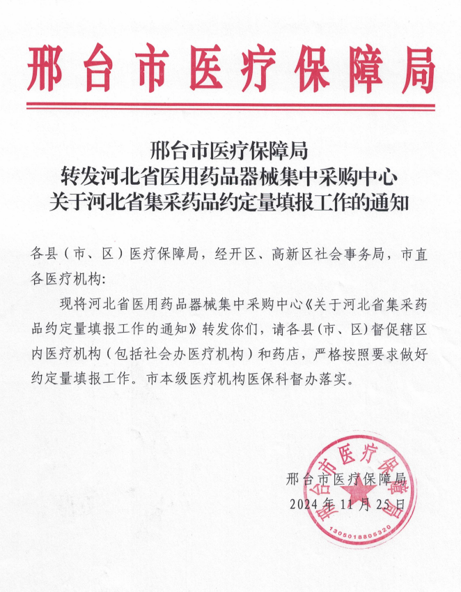 【邢台】邢台市医疗保障局转发河北省医用药品器械集中采购中心关于河北省集采药品约定量填报工作的通知