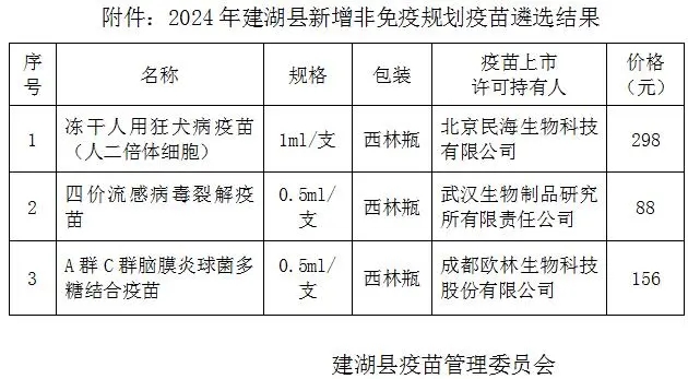 根据《中华人民共和国疫苗管理法》《省卫生计生委办公室关于加强县级疾控中心第二类疫苗采购供应管理工作的通知》《建湖县非免疫规划疫苗采购实施方案》等文件精神,为规范我县非免疫规划疫苗的采购和使用管理,保障疫苗质量和供应,确保预防接种工作安全、有序开展、同时做好廉政风险防范,加强监督管理,保证非免疫规划疫苗采购工作公正、公开、合理、有序地进行。6月26日,建湖县疫苗管理委员会按照依法依规、需求导向、公平公开、集体讨论的原则,召开了新增非免疫规划疫苗遴选会,共3个品种入选,现将遴选结果予以公示。