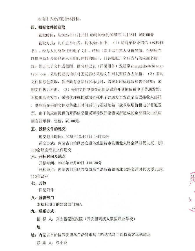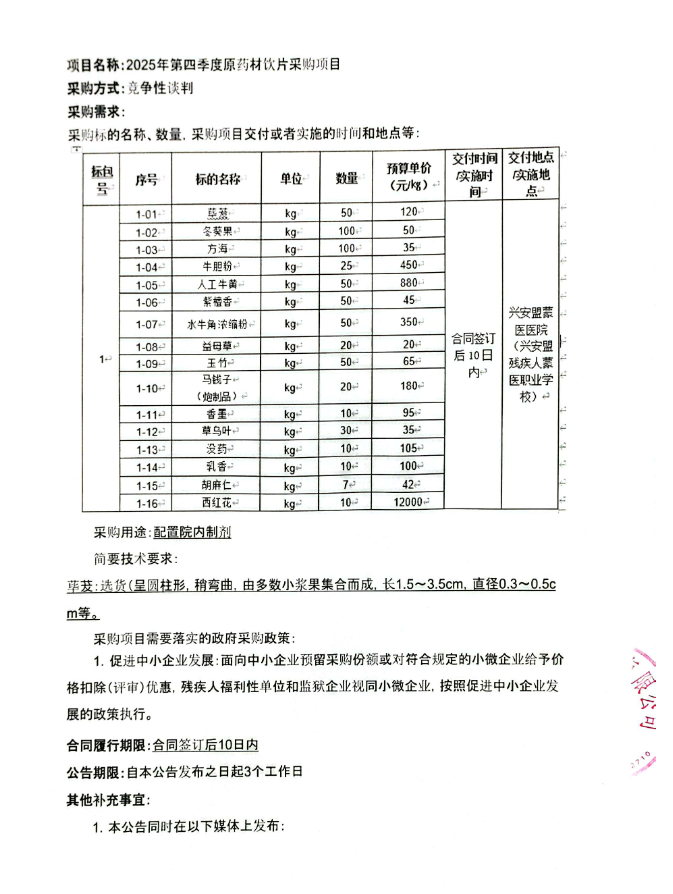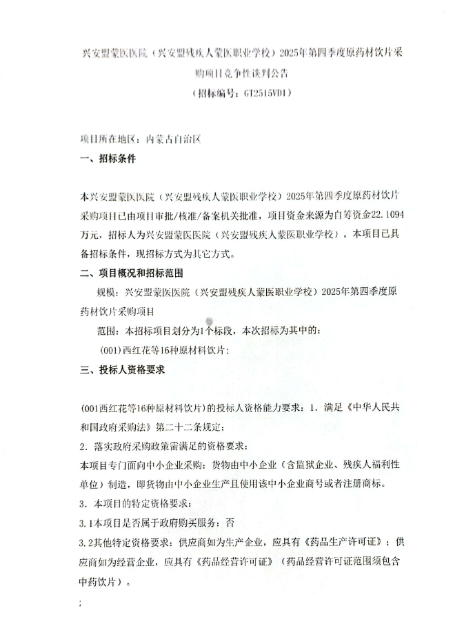 【内蒙古自治区兴安盟蒙医院】内蒙古自治区兴安盟蒙医医院(兴安盟残疾人蒙医职业学校)2025年第四季度原药材饮片采购项目竞争性谈判公告