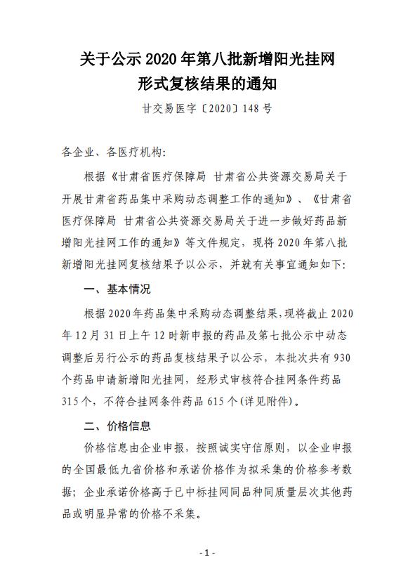 【甘肃】甘肃省关于公示2020年第八批新增阳光挂网形式复核结果的通知 甘交易医字〔2020〕148号