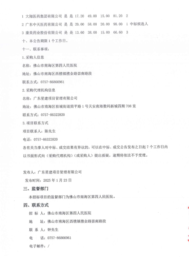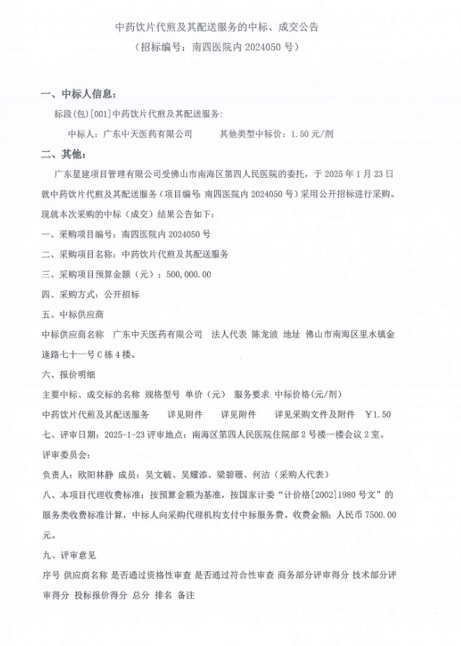 【佛山市南海区第四人民医院】广东省佛山市南海区第四人民医院中药饮片代煎及其配送服务的中标、成交公告