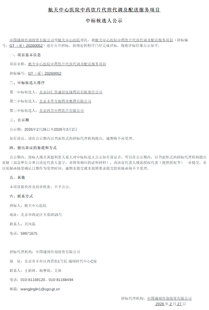 【北京市航天中心医院】北京市航天中心医院中药饮片代煎代调及配送服务项目中标候选人公示北京市航天中心医院中药饮片代煎代调及配送服务项目中标候选人公示