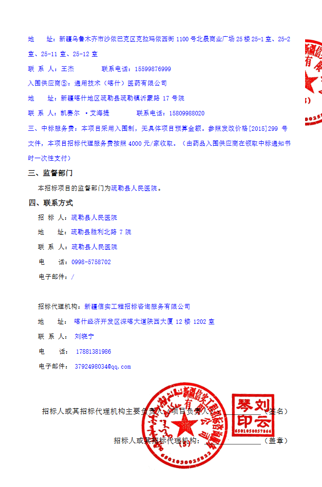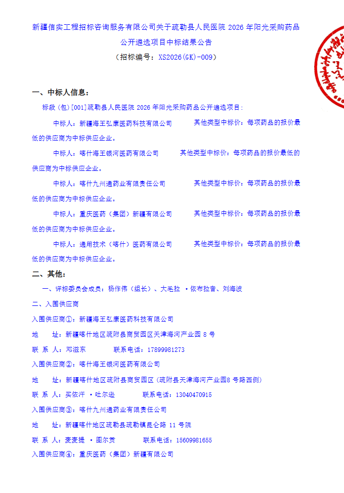 【喀什地区疏勒县人民医院】新疆信实工程招标咨询服务有限公司关于疏勒县人民医院2026年阳光采购药品公开遴选项目中标结果公告