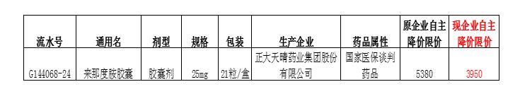 根据企业自主申请,现对正大天晴药业集团股份有限公司 “来那度胺胶囊(25mg *21粒/盒)”统一下调省级集采价格(详见下表),请各医疗机构及时下调相关药品价格。