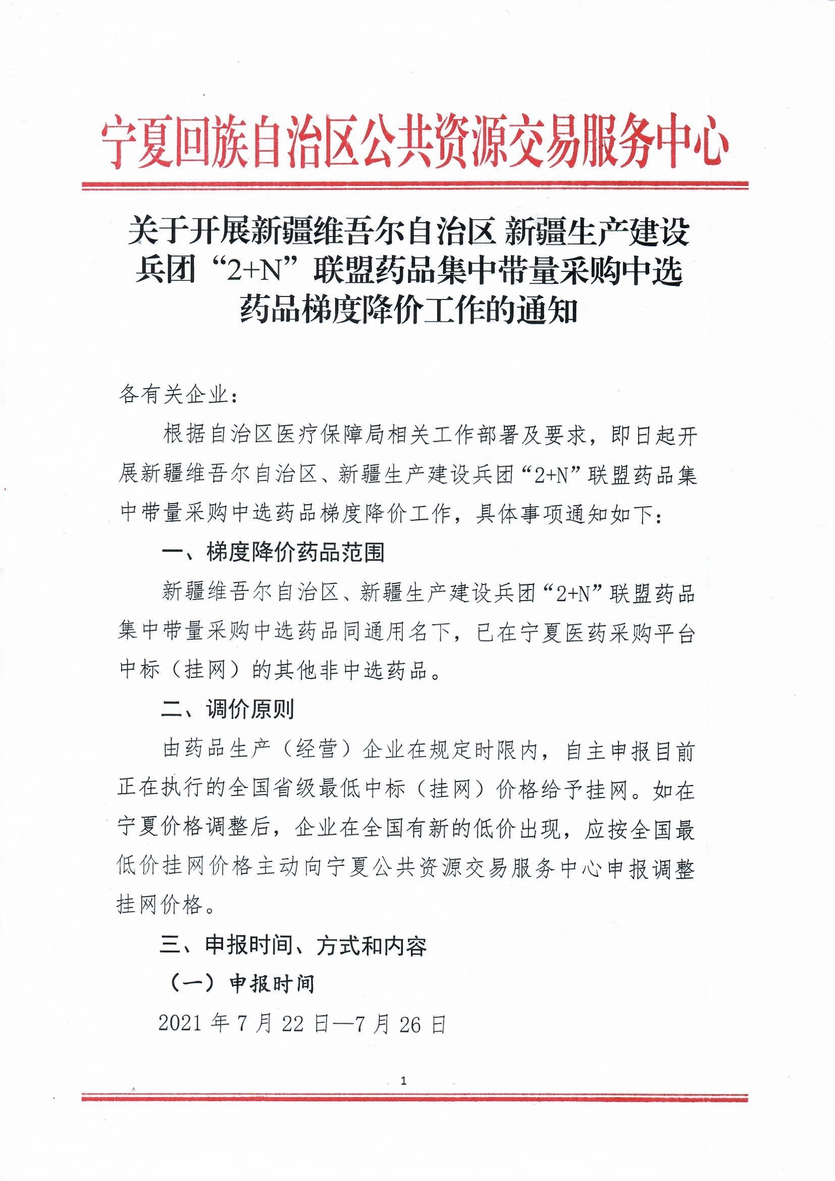 【宁夏】2021年宁夏自治区关于开展新疆维吾尔自治区 新疆生产建设兵团“2+N”联盟药品集中带量采购中选药品梯度降价工作的通知