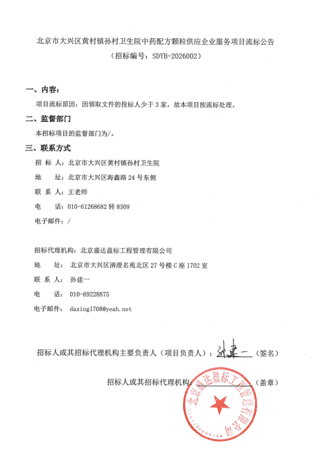 【北京市大兴区黄村镇孙村卫生院】北京市大兴区黄村镇孙村卫生院中药配方颗粒供应企业服务项目流标公告