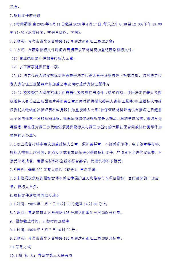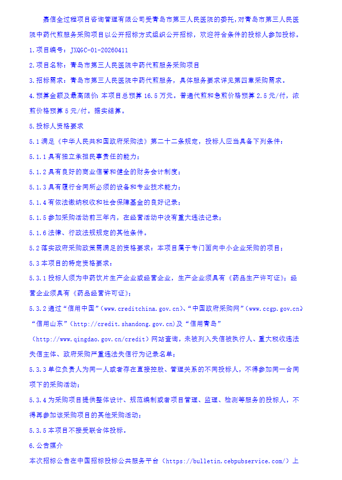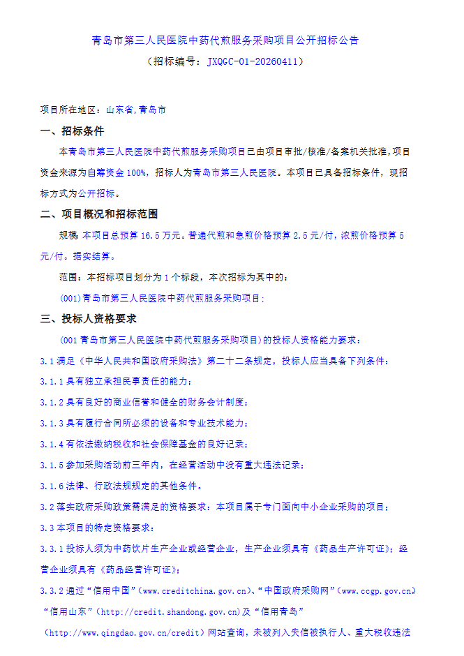 【青岛市第三人民医院】山东省青岛市第三人民医院中药代煎服务采购项目公开招标公告