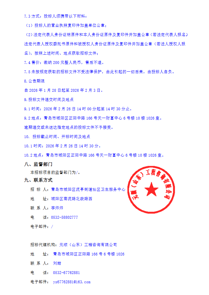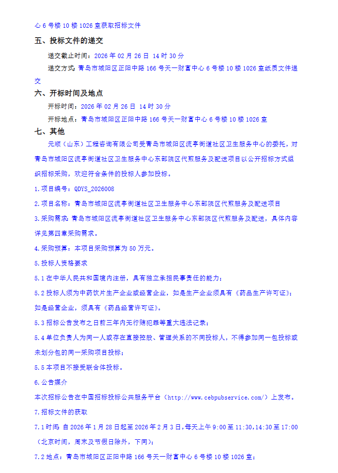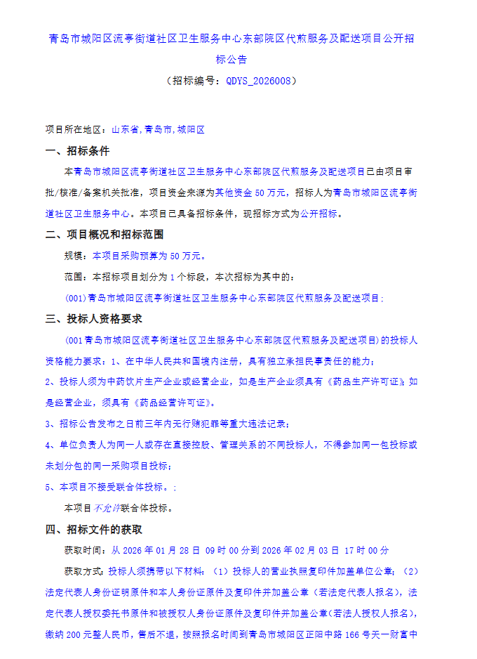 【青岛市城阳区流亭街道社区卫生服务中心】山东省青岛市城阳区流亭街道社区卫生服务中心东部院区代煎服务及配送项目公开招标公告