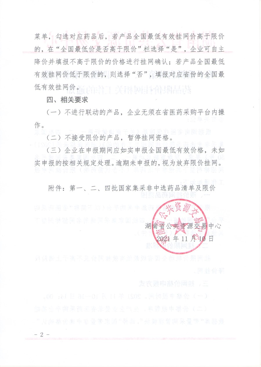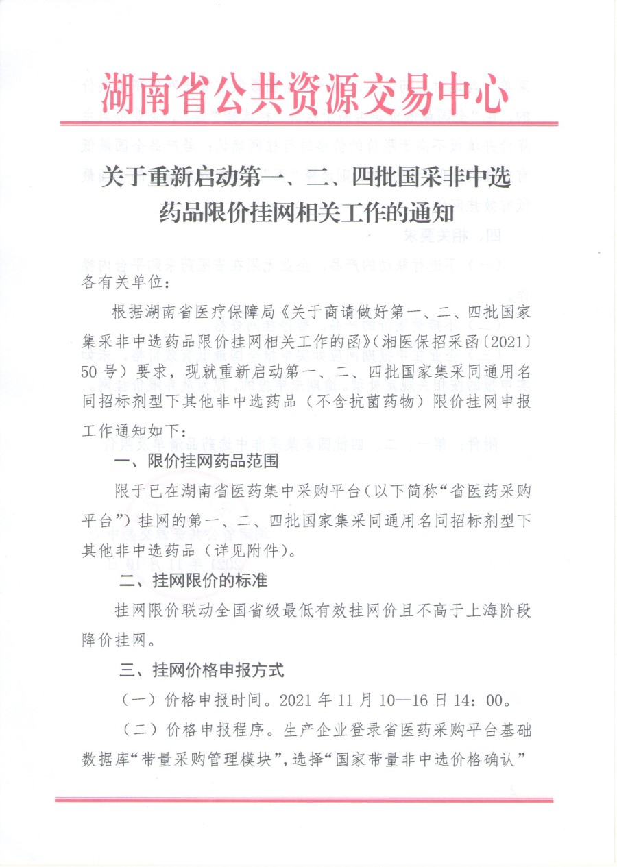 【湖南】2021年湖南省关于重新启动第一、二、四批国采非中选药品限价挂网相关工作的通知