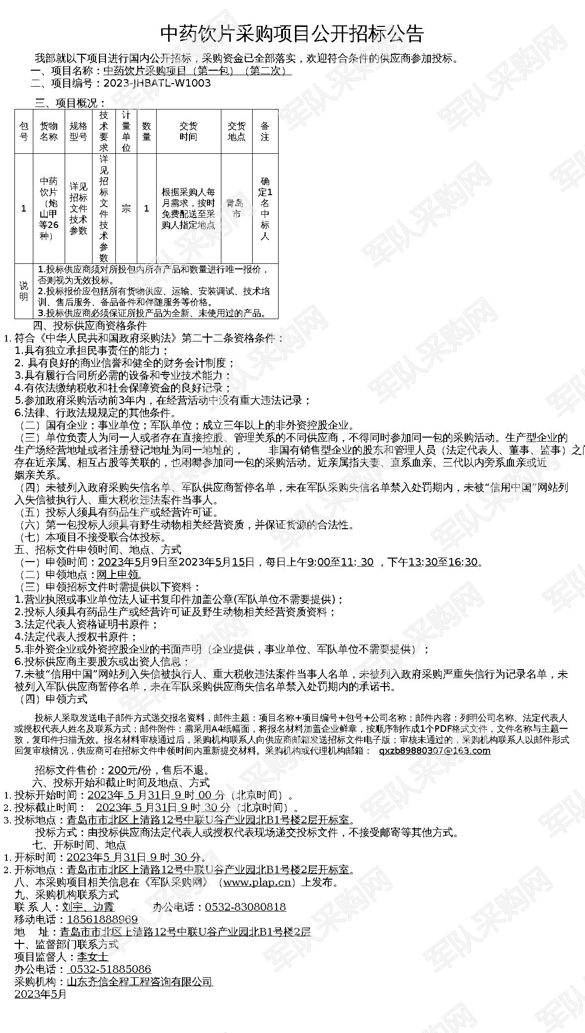 【军队采购】军队采购网中药饮片采购项目公开招标公告(2023-JHBATL-W1003)(20230509)