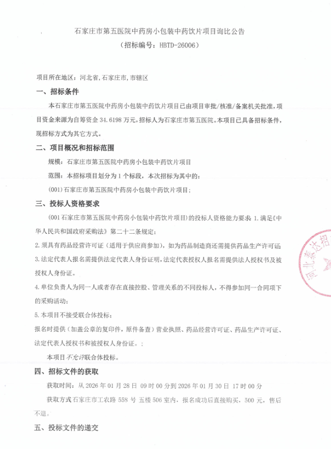 【石家庄市第五医院】河北省石家庄市第五医院中药房小包装中药饮片项目询比公告