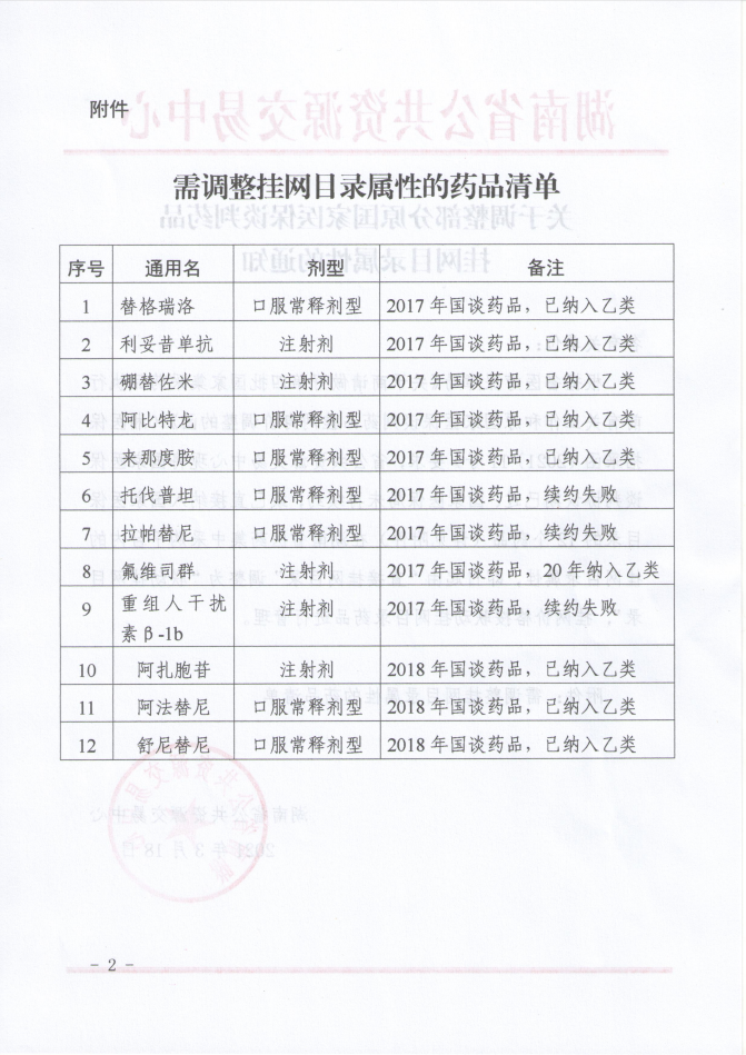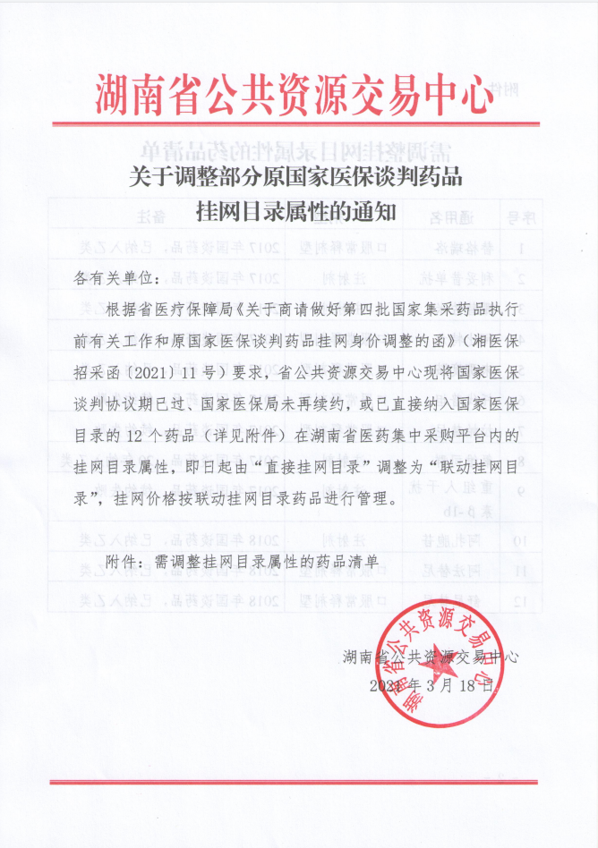 【湖南】2021年湖南省关于调整部分原国家医保谈判药品挂网目录属性的通知