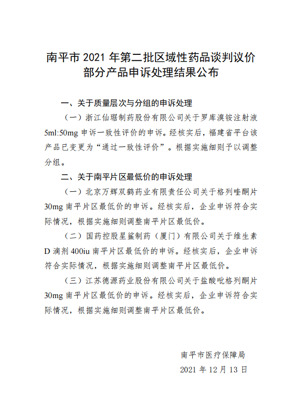 【南平】福建省南平市2021年第二批区域性药品谈判议价部分产品申诉处理结果公布