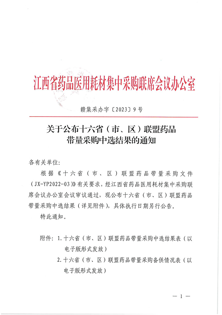 根措《十六省(市、区)联里药品带量采购文件(JX-YP2022-03)》有关要求,经江西省药品医用耗材集中采购联席会议办公室会议审议通过,现公布干六省(市、区)联盟药品带量采购中选结果(详见附件),具体执行日期另行公告。