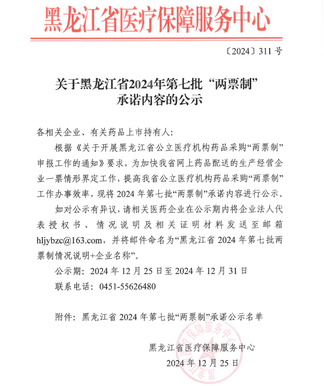 【黑龙江】关于黑龙江省2024年第七批“两票制”承诺内容的公示
