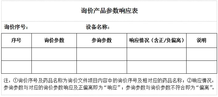 3、参询产品的参数响应表(据实提供实际参数值,有正/负偏离请标注并予以说明)(格式见附表2);
