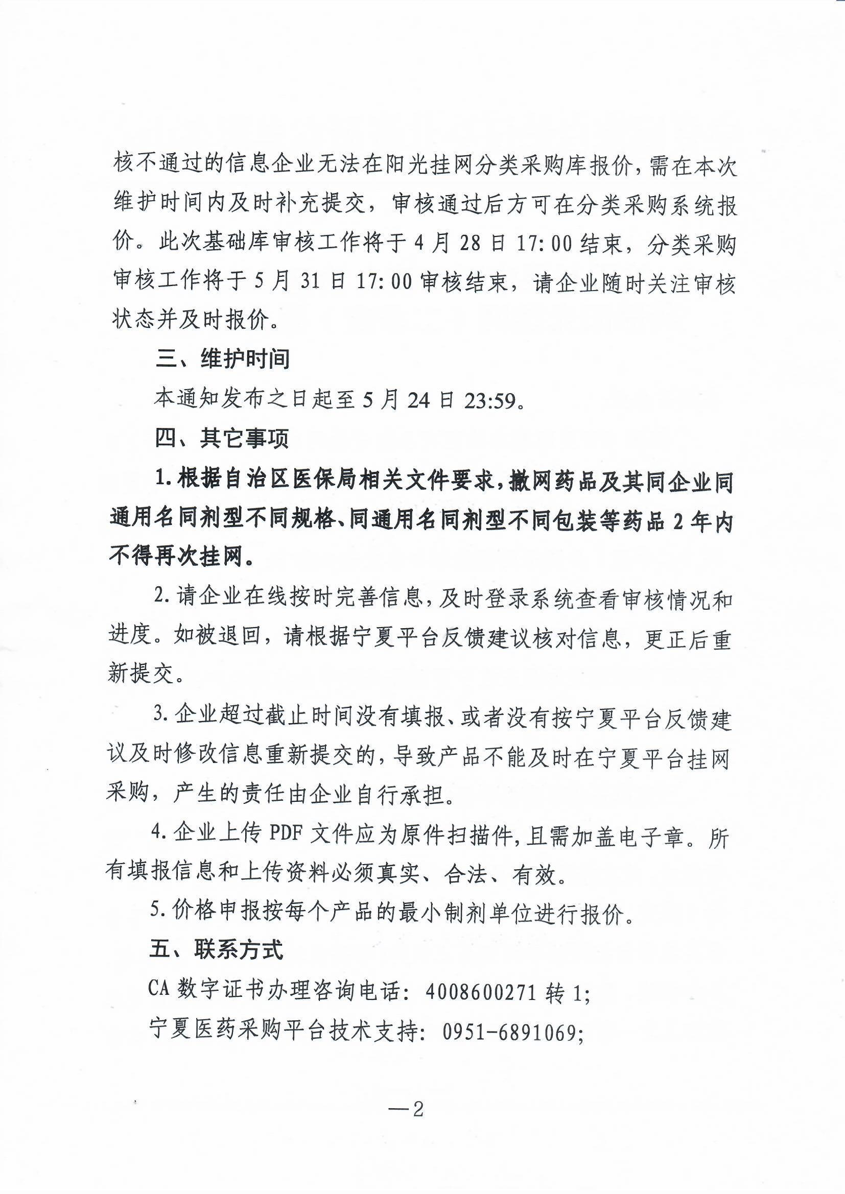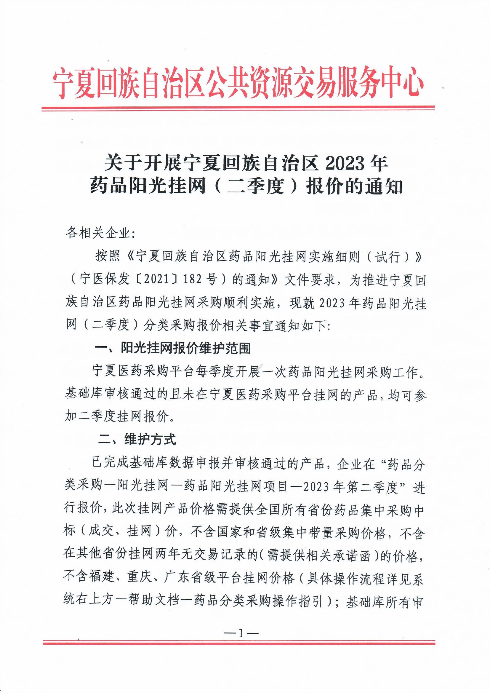 按照《宁夏回族自治区药品阳光挂网实施细则(试行)》(宁医保发〔2021〕182号)的通知》文件要求,为推进宁夏回族自治区药品阳光挂网采购顺利实施,现就2023年药品阳光挂网(二季度)分类采购报价相关事宜通知如下: